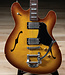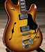 This GF6 has all the feels of a vintage piece. The mahogany body sports a maple top with light distressing, enough you won’t be worried about putting the first ding on it. A unique design feature of the GF6 that is well worth mentioning—as a point of differentiation from most semi-hollow guitars—is that it utilizes a solid top and solid back/sides. This gives it a bit more response and a really wonderful acoustic quality when playing.