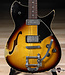 This baby feels slinky in the hand with a 24.75” scale length. The body is smaller than a typical semi-hollow, but every bit as resonant with its solid maple top and solid alder back & sides. The neck profile is Gibson-inspired but of the period-correct late ‘50s persuasion, comfy and not overblown like many of the reissues. The string action on the guitar measures barely a hair over 4/64” on the low E string at the 12th fret, and nearly down to 3/64” on the high E.